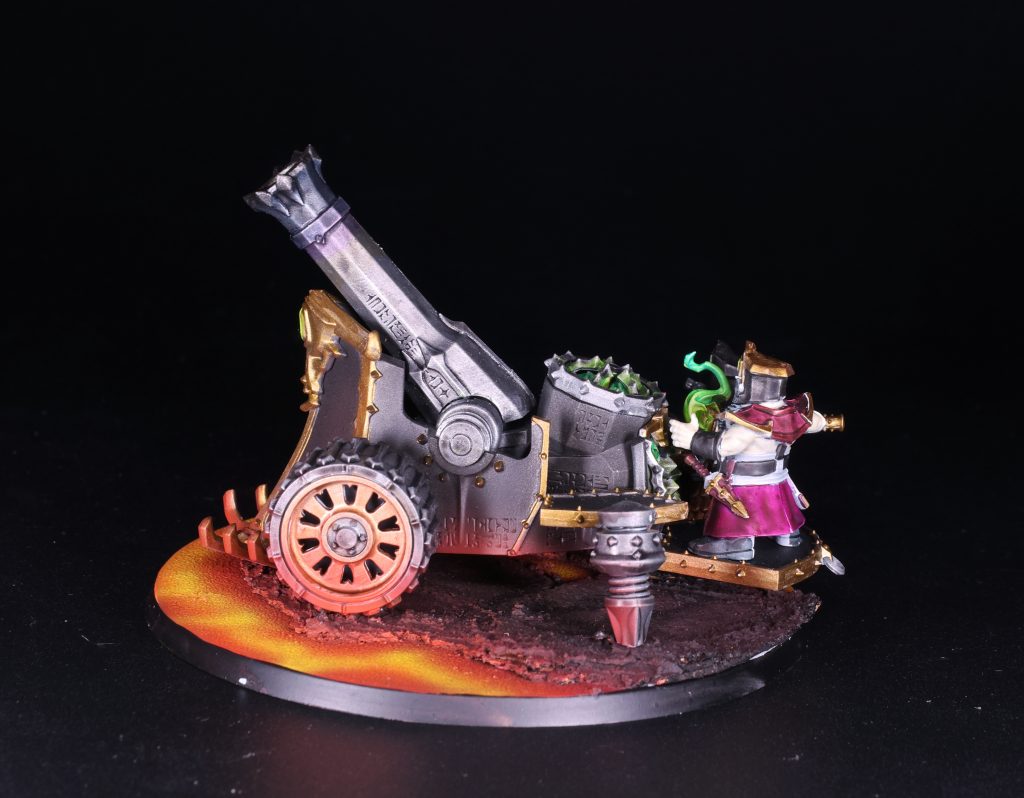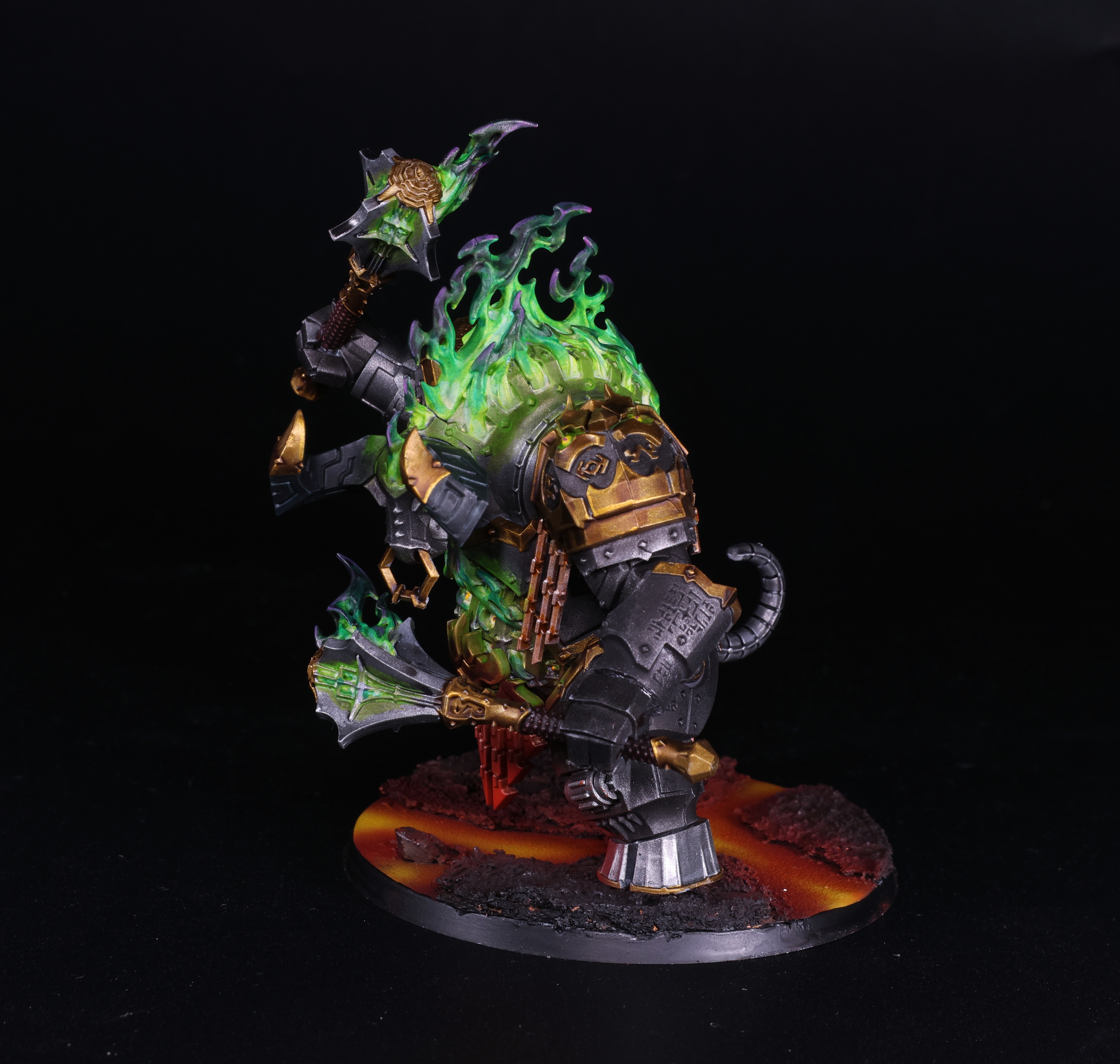 Al fuego le he dado un toque morado para reforzar la idea de que es un fuego demoniaco más que fuego «de forja» (De hecho fijaos que tiene ojos mezclados entre las llamas. Y con el morado, de paso, ayudo a diferenciarlo del fuego brujo de los Skaven, que al ser verde podía acabar siendo muy parecido.