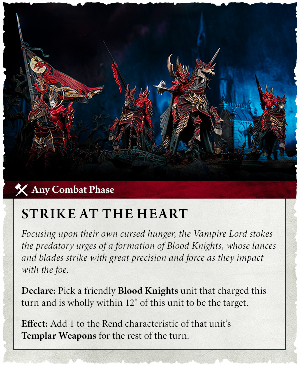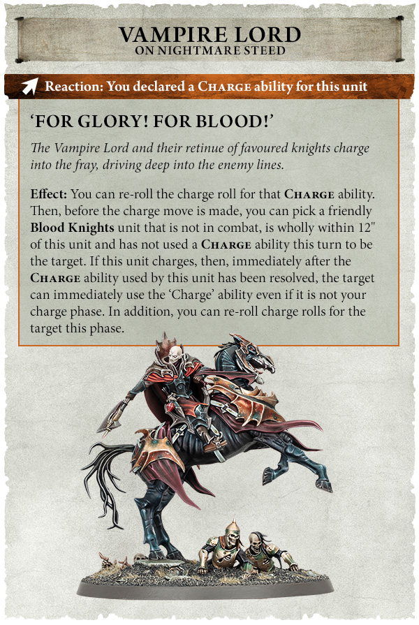 Si esa carga/contracarga doble te ha sabido a poco, una unidad de Caballeros Sangrientos que haya cargado este turno y esté completamente a 12″ del Señor Vampiro se beneficiará de un +1 Perforar, para que mandes al rival calentito a la cama.