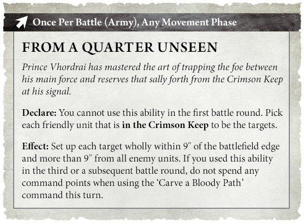 Hasta la mitad de tus unidades pueden empezar la partida en reserva, para llegar a partir de la segunda ronda. Al llegar a la mesa, cada unidad se sitúa a 9″ del enemigo y completamente a 9″ de cualquier borde. Y si llegas a partir de la tercera ronda, no pagas punto de mando por Carve a Bloody Path, que le permite a una unidad de Caballeros Sangrientos cargar aunque estés en combate y aunque ya hayas cargado ese turno. Parece divertido desde luego, y quizás deberían cambiarle el nombre al ejército de renombre por «Hasta la Cocina y Más Allá»