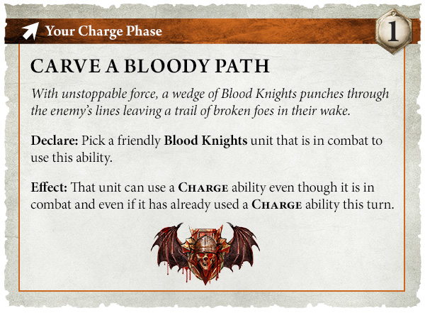 Como veis, no sólo repite su propia tirada de carga, si no que, además, hace que una unidad de Caballeros Sangrientos completamente a 12″ de él le acompañe cargando y también repita su tirada aunque no sea tu propia fase de carga. ¡A contracargar se ha dicho!